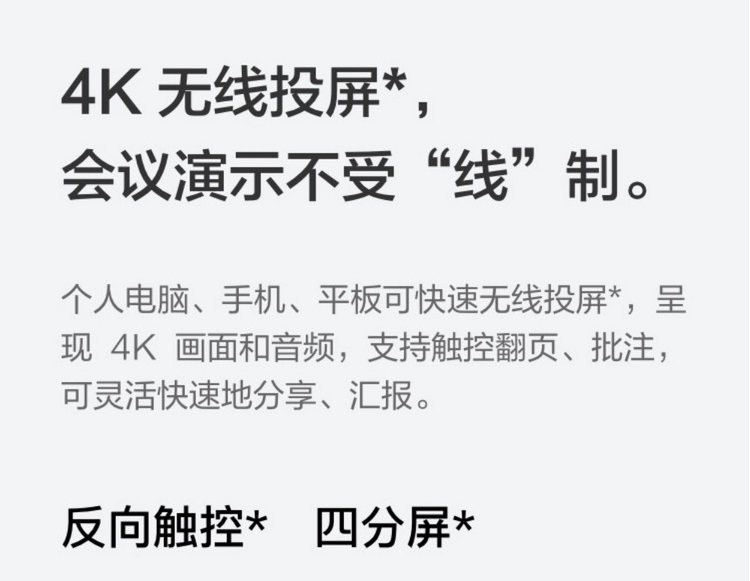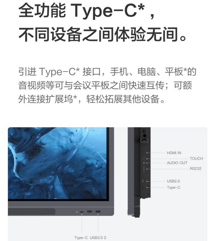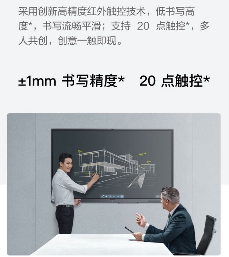 包裝清單: 會議平板*1臺、PC模塊*1、傳屏器*1、智能筆*1、移動支架*1、雙色筆*2支、AC電源線*1個、壁掛套件*1個、保修卡、安裝指南*1份